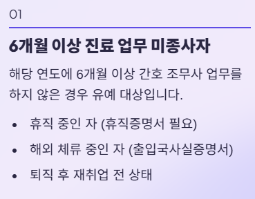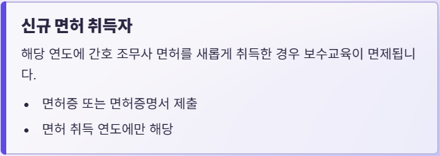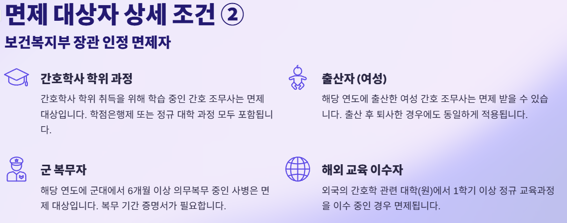 | 1. 신규 자격 취득자 (해당 연도) 2. 간호학을 전공하는 대학생/대학원생 3. 입원 등 6개월 이상 업무 종사가 불가능한 경우 4. 군 복무자 등 |