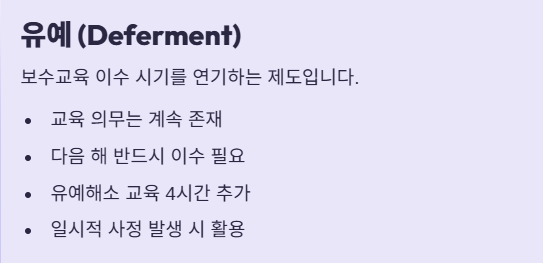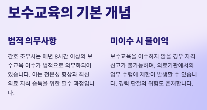 - 미이수 시 불이익: 3년마다 돌아오는 '자격 신고'가 불가능하며, 신고를 하지 않을 경우 자격 효력이 정지될 수 있습니다.
