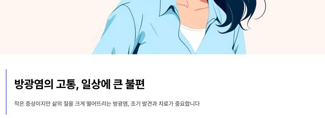 통증을 참는 것은 미덕이 아닙니다. 증상이 느껴진다면 지체 없이 병원을 찾고, 오늘 알려드린 식단 관리로 재발 없는 건강한 일상을 되찾으시길 바랍니다.
