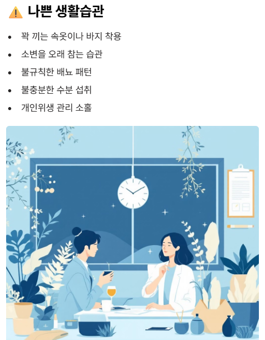 이 외에도 꽉 끼는 스키니진 착용, 소변을 오래 참는 습관, 과도한 스트레스와 수면 부족으로 인한 면역력 저하가 주된 원인으로 꼽힙니다. 폐경 후 여성의 경우 에스트로겐 감소로 인해 질 내 유익균이 줄어들면서 감염 위험이 높아지기도 합니다.