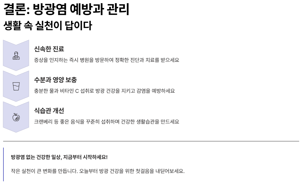 지금까지 방광염 증상과 원인 좋은음식 치료법에 대해 상세히 알아보았습니다. 방광염은 면역력이 떨어지면 언제든 다시 찾아올 수 있는 불청객입니다. 하지만 적절한 항생제 치료와 함께 물 마시기, 크랜베리 섭취 등 생활 습관을 교정한다면 충분히 이겨낼 수 있습니다.