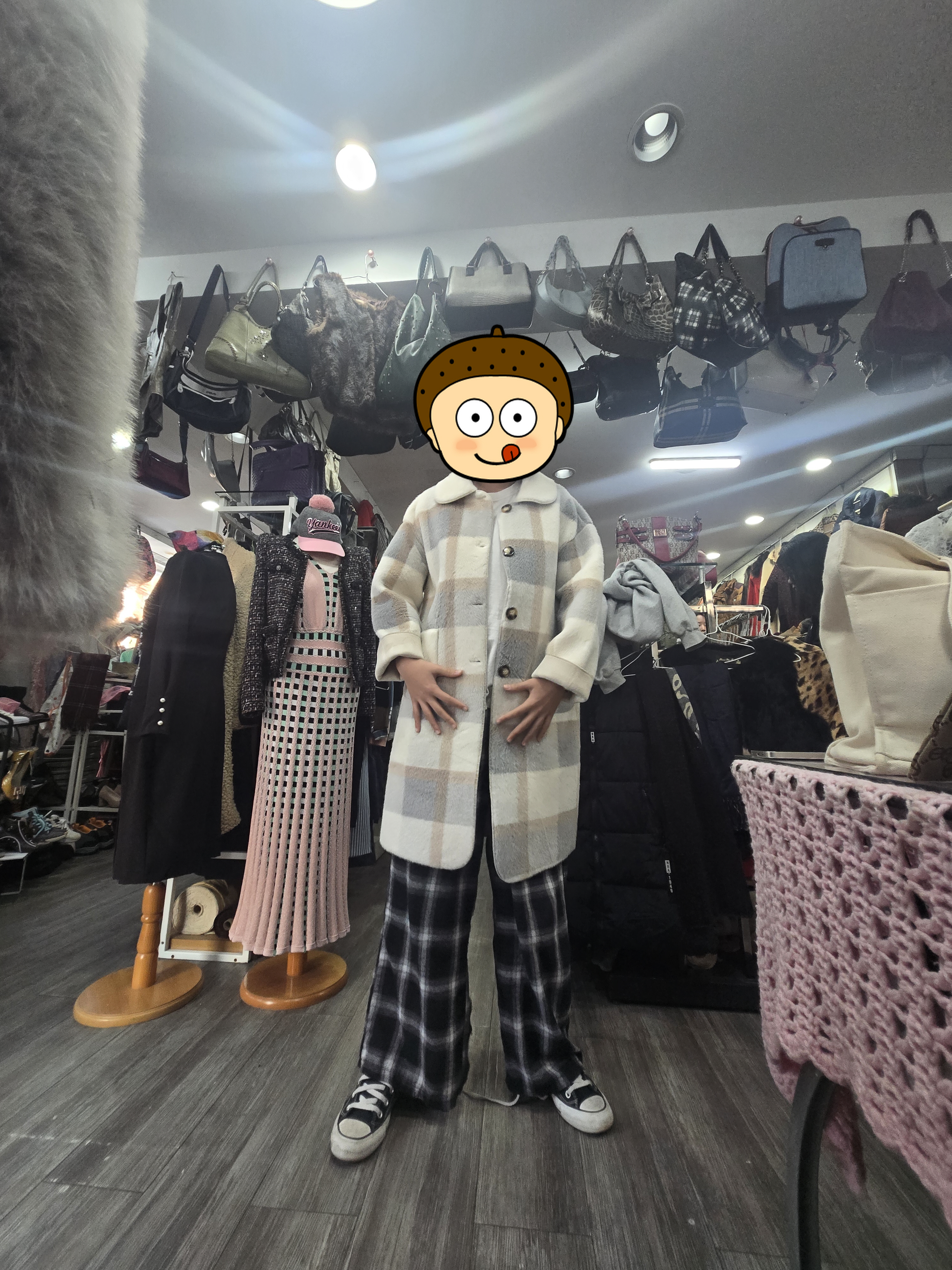 아이는 마음에 드는 체크 코트를 입고 포즈를 취해보고, 저도 평소 도전해 보고 싶었던 스타일의 후드티와 가방을 매치해 보았습니다. 백화점이었다면 가격표부터 확인하느라 망설였겠지만, 여기서는 착한 가격 덕분에 마음껏 고르는 재미가 있습니다.