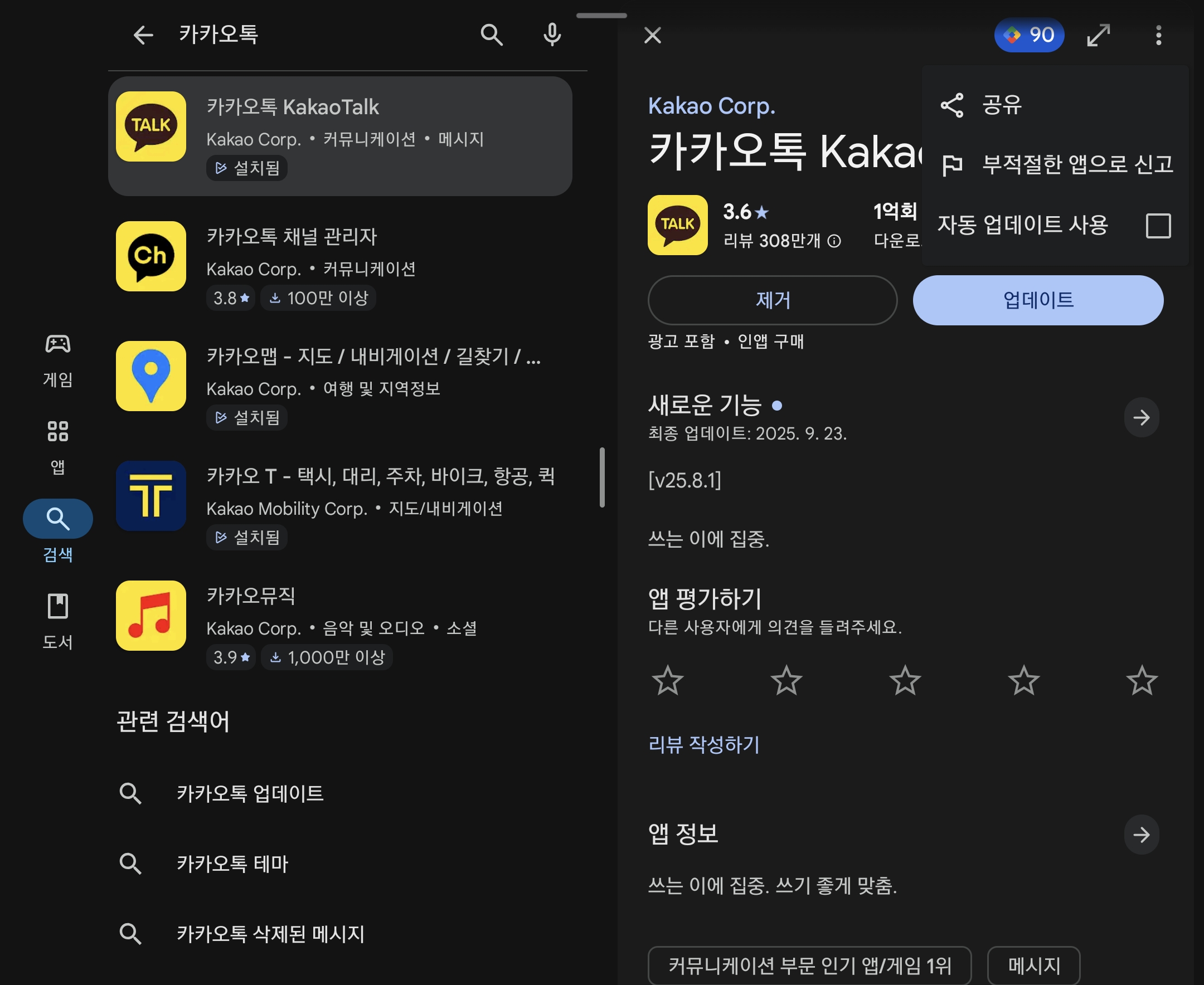 - Google Play에서 자동 업데이트를 끄거나, 계정 설정에서 카카오톡 자동 업데이트 제외 처리를 합니다. (자동으로 최신 버전으로 올라가면 다시 변경됩니다)