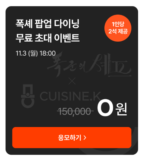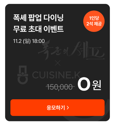 - 앱 내 이벤트/프로모션 섹션에서 '폭군의 셰프 팝업 다이닝' 배너를 찾습니다.(아래 응모이용시 바로가기)