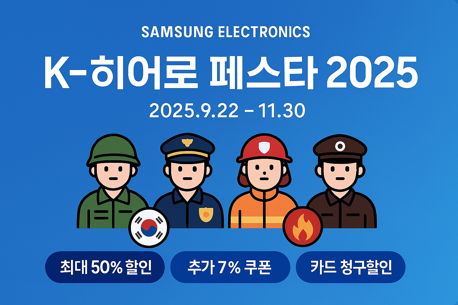 국가안보·안전 종사자 대상 삼성전자 ‘K-히어로 페스타’—2025년 9월 22일~11월 30일, 최대 50% 할인과 추가 7% 쿠폰, 카드 청구할인까지 한눈에.