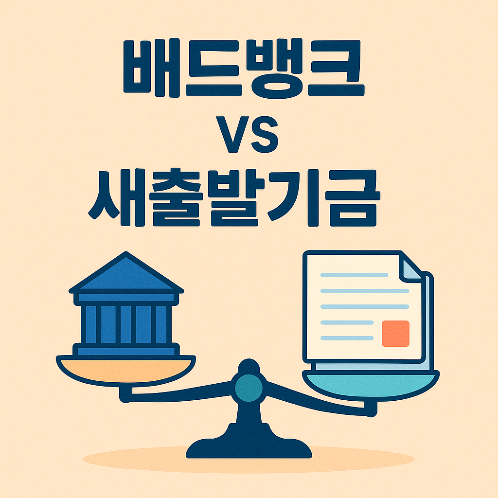 배드뱅크는 장기 연체 채권 정리, 새출발기금은 소상공인의 직접적 채무조정에 초점이 맞춰져 있습니다. 본인 상황(연체 기간, 소득·매출, 증빙 가능성)을 기준으로 접근하세요.